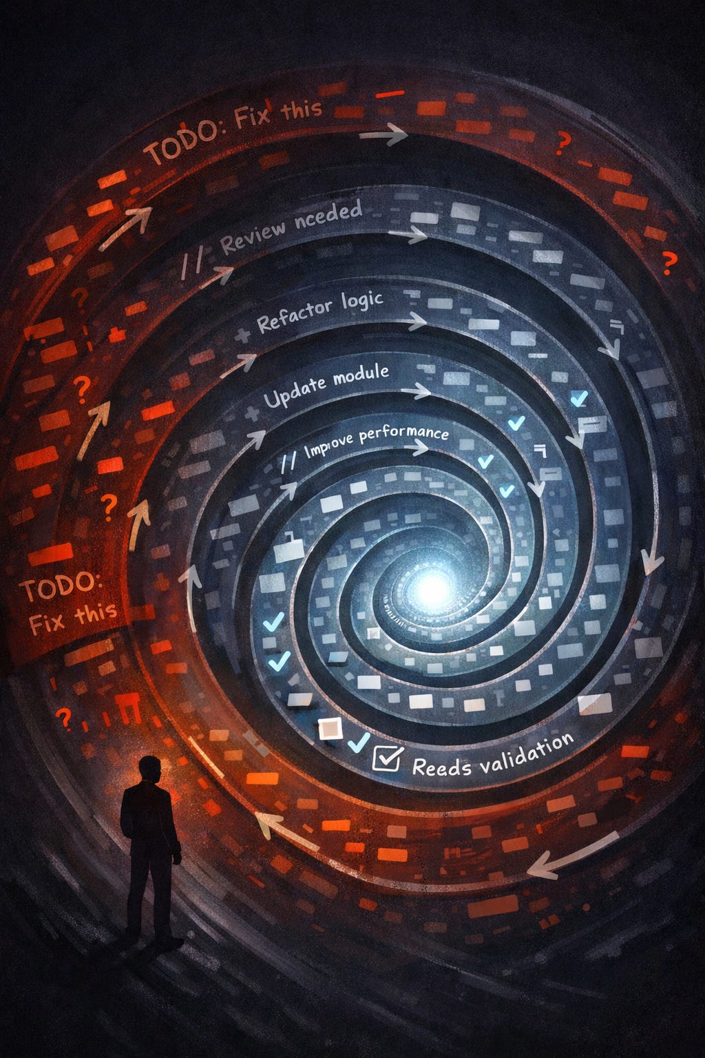 The process becomes cyclic rather than linear. Work proceeds not through perfect plans but through repeated tightening. A rough implementation appears quickly. It is reviewed, criticized, adjusted, reviewed again. Each pass improves something small. Each cycle locks the gain before the next begins.